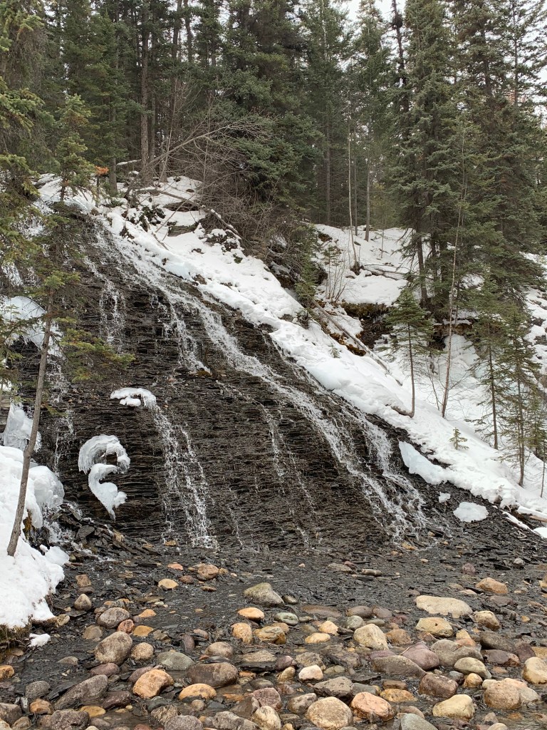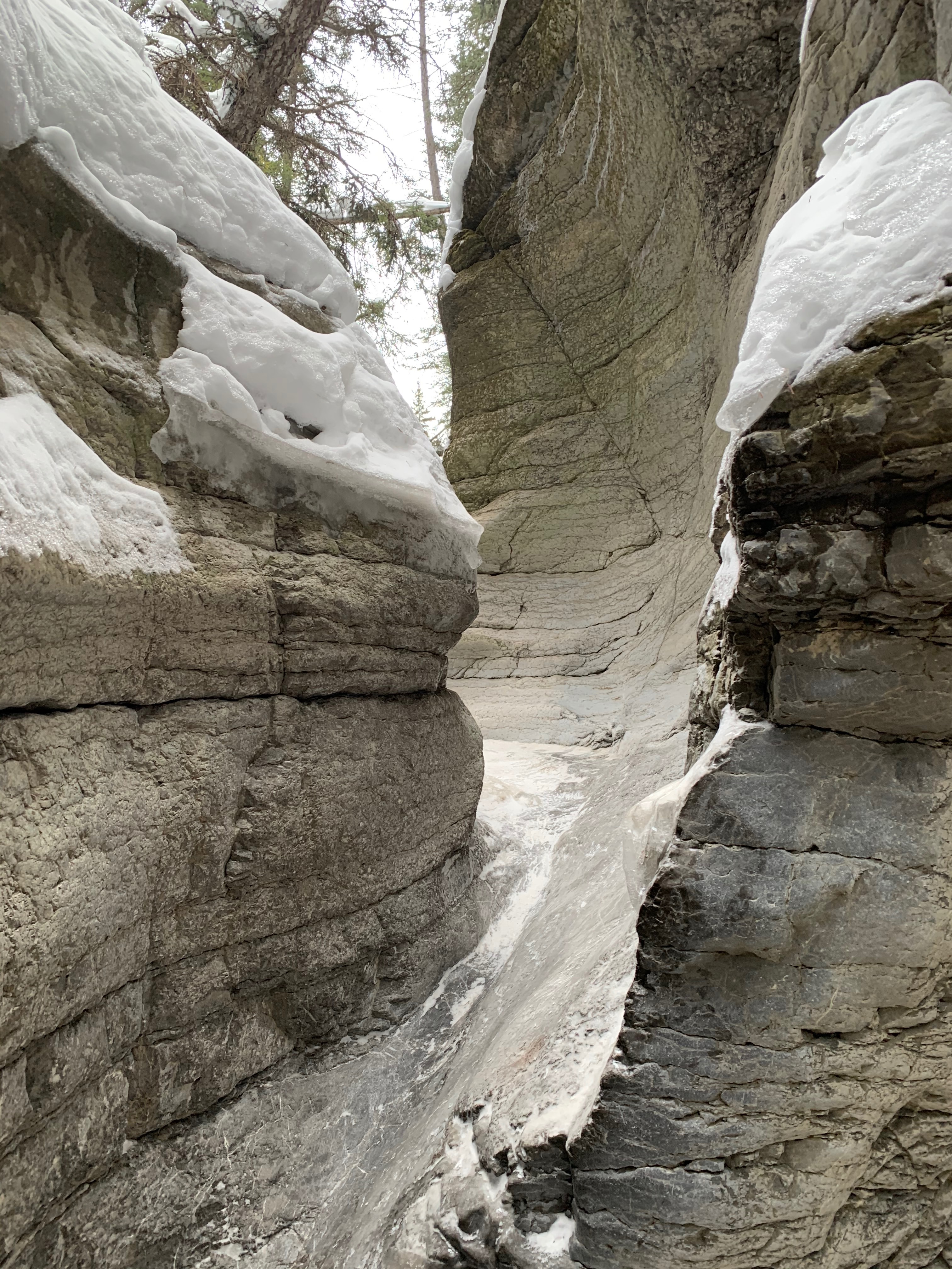 We walked past a few frozen waterfalls. The rivers below the waterfall sounded like washing machines due to the frozen upper layer but rushing water underneath. At the exit of the Maligne Canyon, there is a small natural rock slide. To finish the tour, we walked along the river.