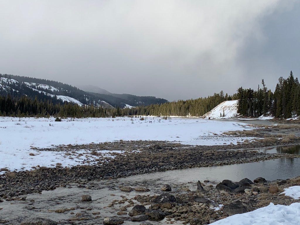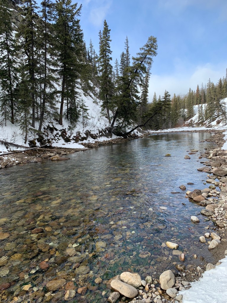 After skating, we found a hidden pathway next to the lake leading to the Athabasca River. In the distance, there were elk roaming about. The mountain landscape was charming.
