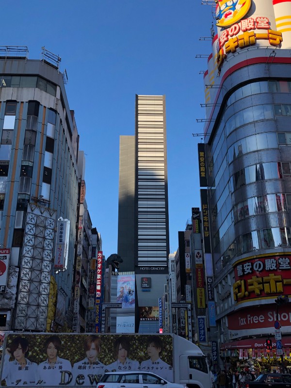 Our next stop was the Tokyo Metropolitan Government Building. On our way, we picked up some snacks and Suntory drinks (sweet alcoholic beverages — these are great!) at a Don Quijote in Shinjuku. Note: Don Quijote is an enormous discount store with a cramped store layout. They sell everything — electronics, luggage, skincare, snacks, alcohol, and the list goes on. Anything you need, Don Quijote will likely have. Across from Don Quijote is the Godzilla head, a landmark in Kabukicho. You can see its head peeking out behind the building.