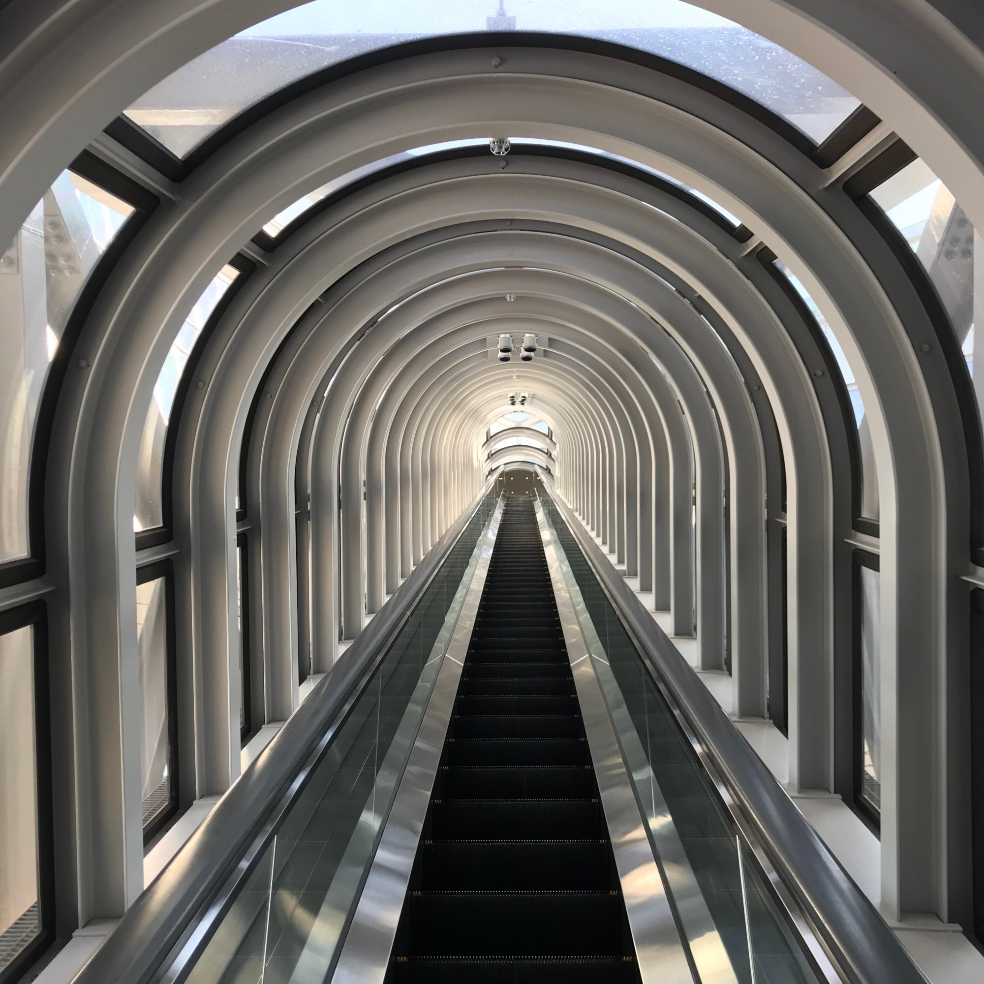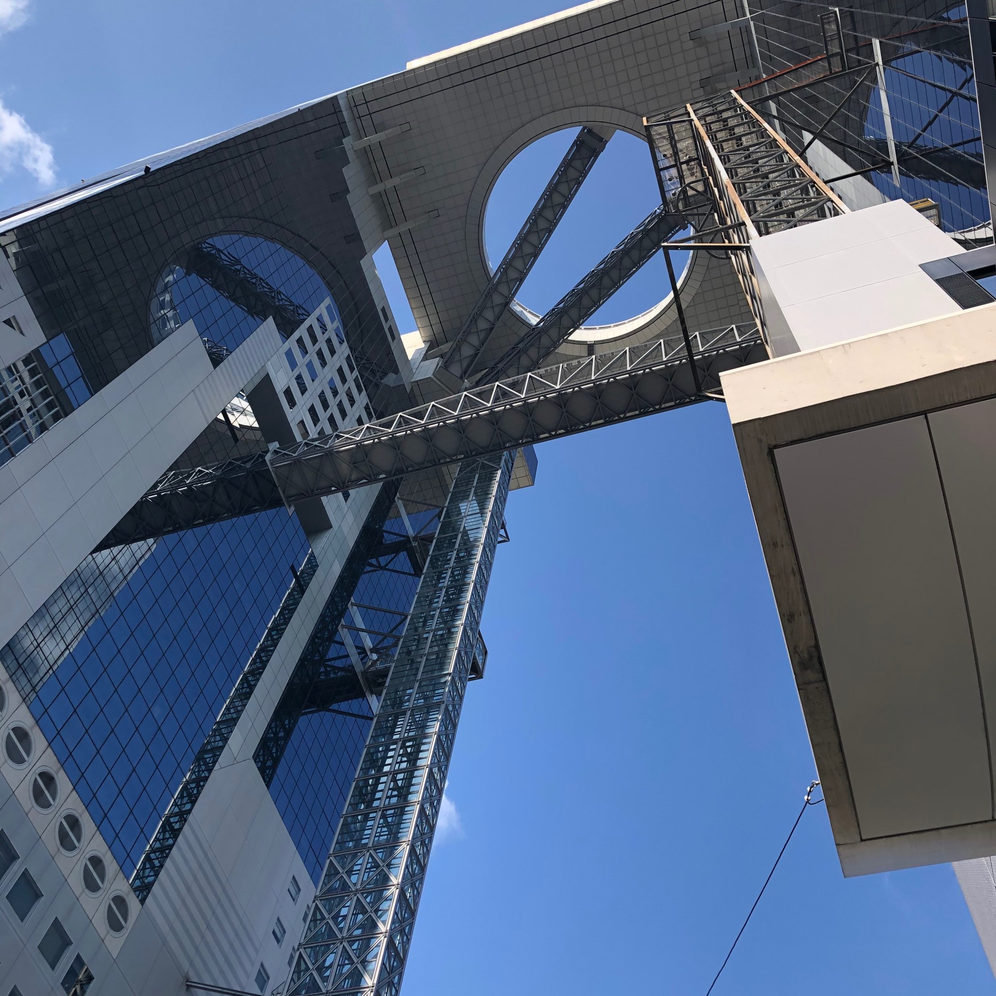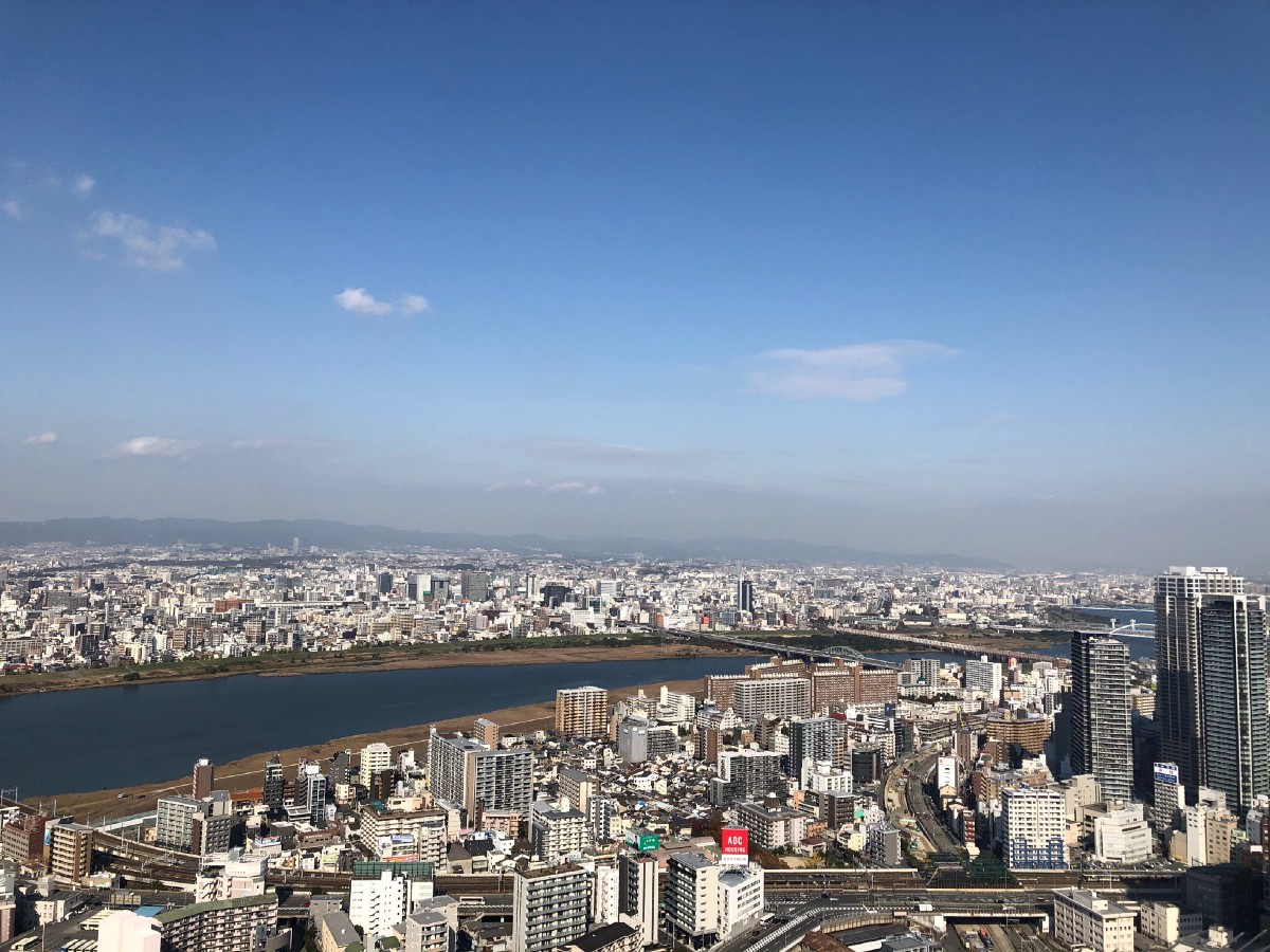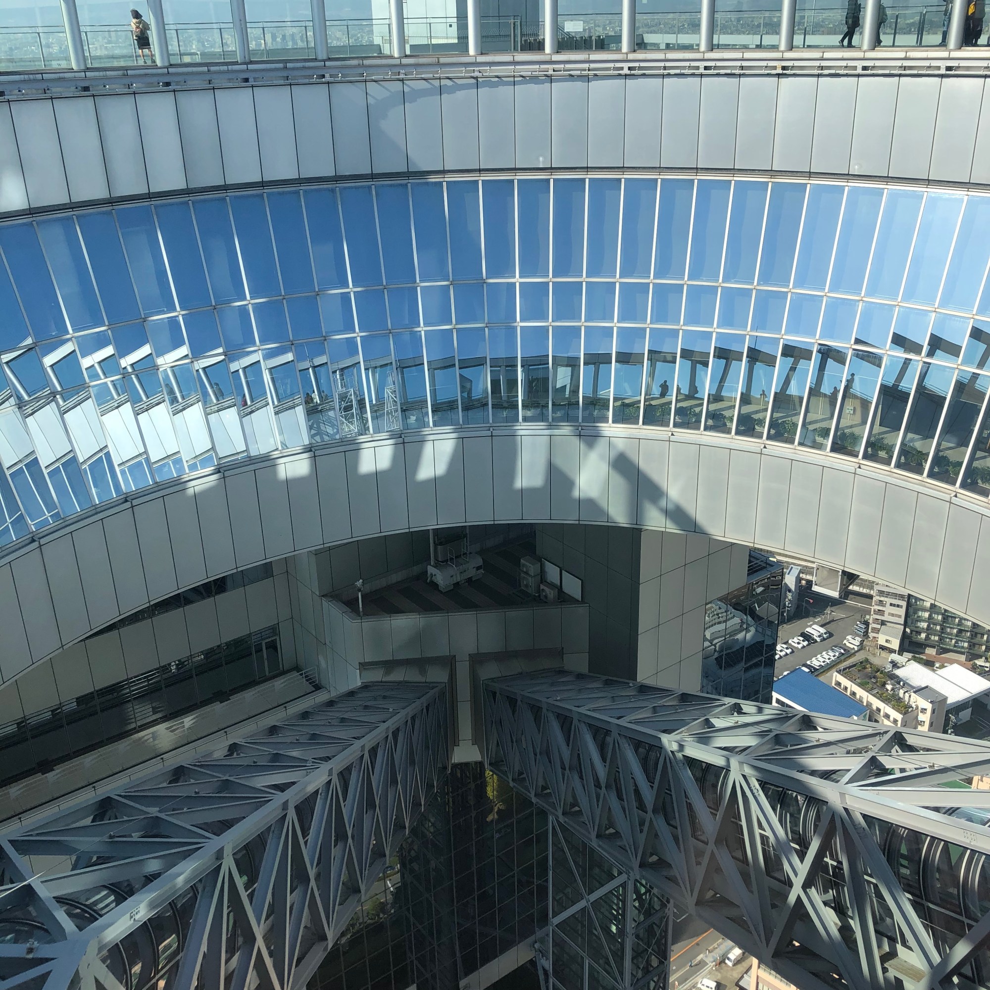 Our next destination was the Umeda Sky Building. After taking the elevator up to the ticket booth, we ascended a portal-like escalator to the Floating Garden Observatory on the 39th floor. There is both an indoor and outdoor viewing area. The air was crisp and refreshing as we took in the Osaka sights.