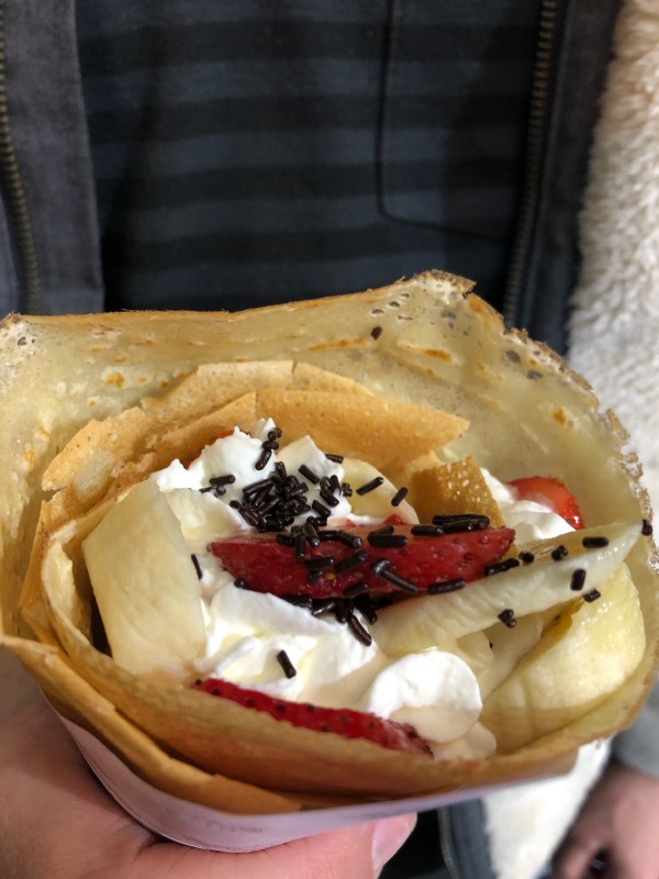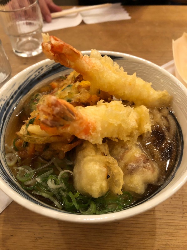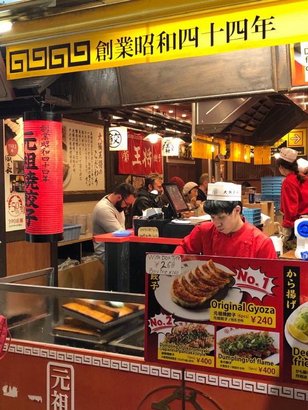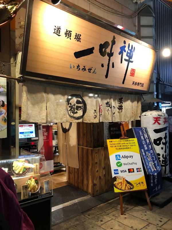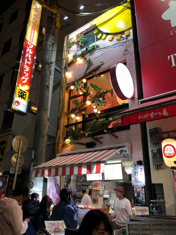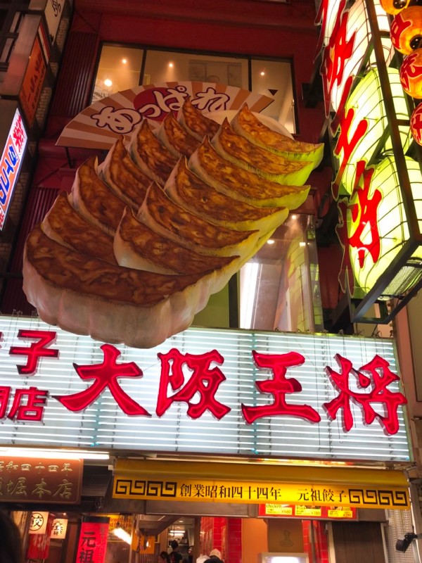 Now, the street food in Dotonbori! We started by visiting a tempura restaurant (not really a street food, but the night tour guide suggested it) — Ichimizen. We ordered their soba noodles in a hot broth topped with tempura. The portion was big and it is one of the cheaper tempura options in the area. Next was Osaka Ohsho, recognizable by the giant plate of gyoza hanging on the building. We ordered the gyoza and chicken karaage. The gyoza was crunchy and tasty! For dessert, we shared a strawberry banana crepe from Dotonbori Crepe. So sweet and delicious!