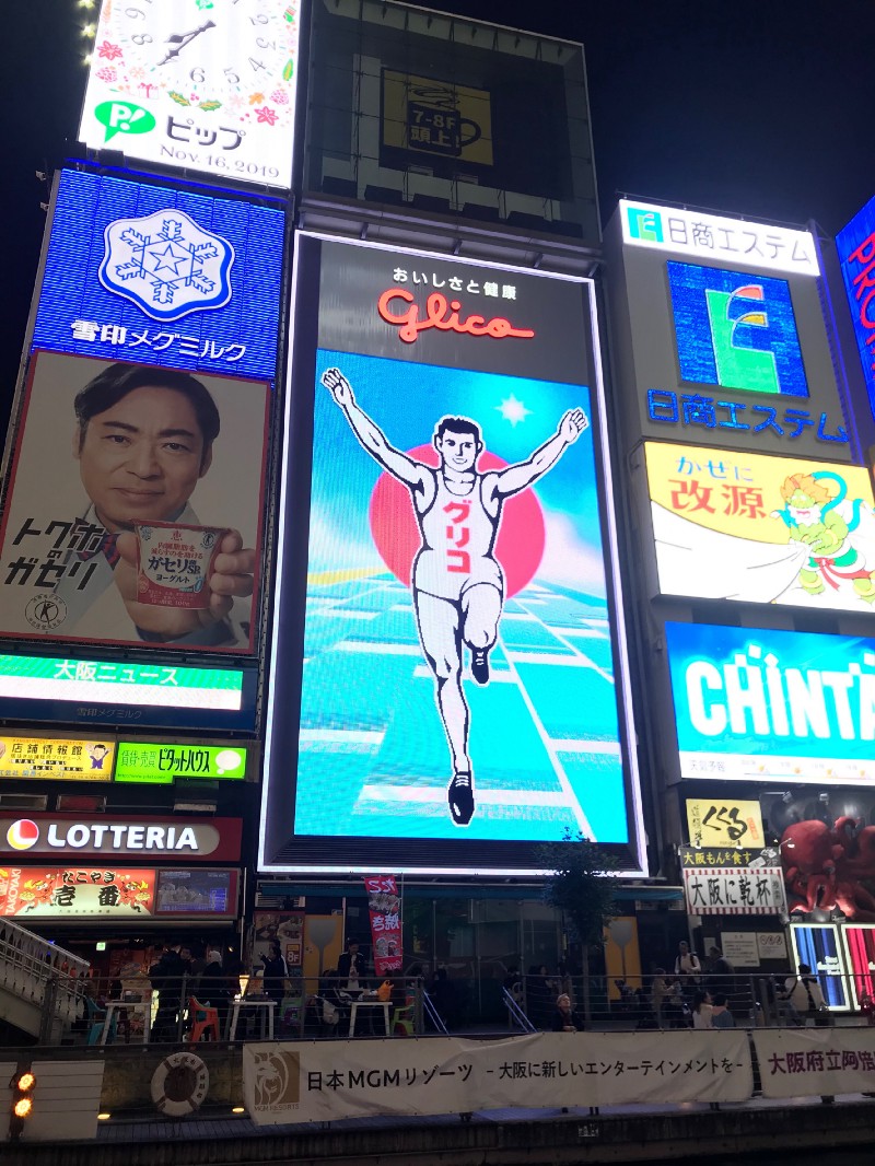 The night walking tour was the last item on our OAP agenda. We were ready to sample the street food in Dotonbori. Dotonbori is a principal tourist destination in Osaka — due to the food and illuminated street boards. Here’s a photo of Glico Man, a well-known Osaka landmark.