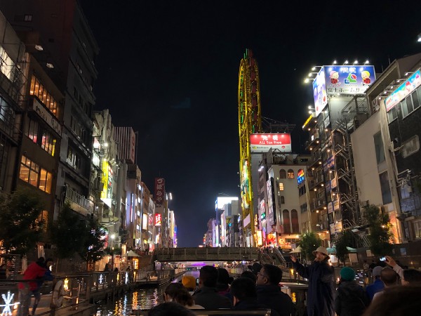Upon arriving in Dotonbori, we tried to get tickets to the Tombori River Jazz Boat, but they were all sold out of OAP seats. Instead, we decided on the Tombori River Cruise (no jazz band). Note: This is another item where you can only get tickets to one of the two attractions. The jazz option sells out pretty early, so it is best to get them as soon as you can. We boarded the boat and cruised along Dotonbori canal — passing the Dotonbori streets and the bright Glico Man sign.