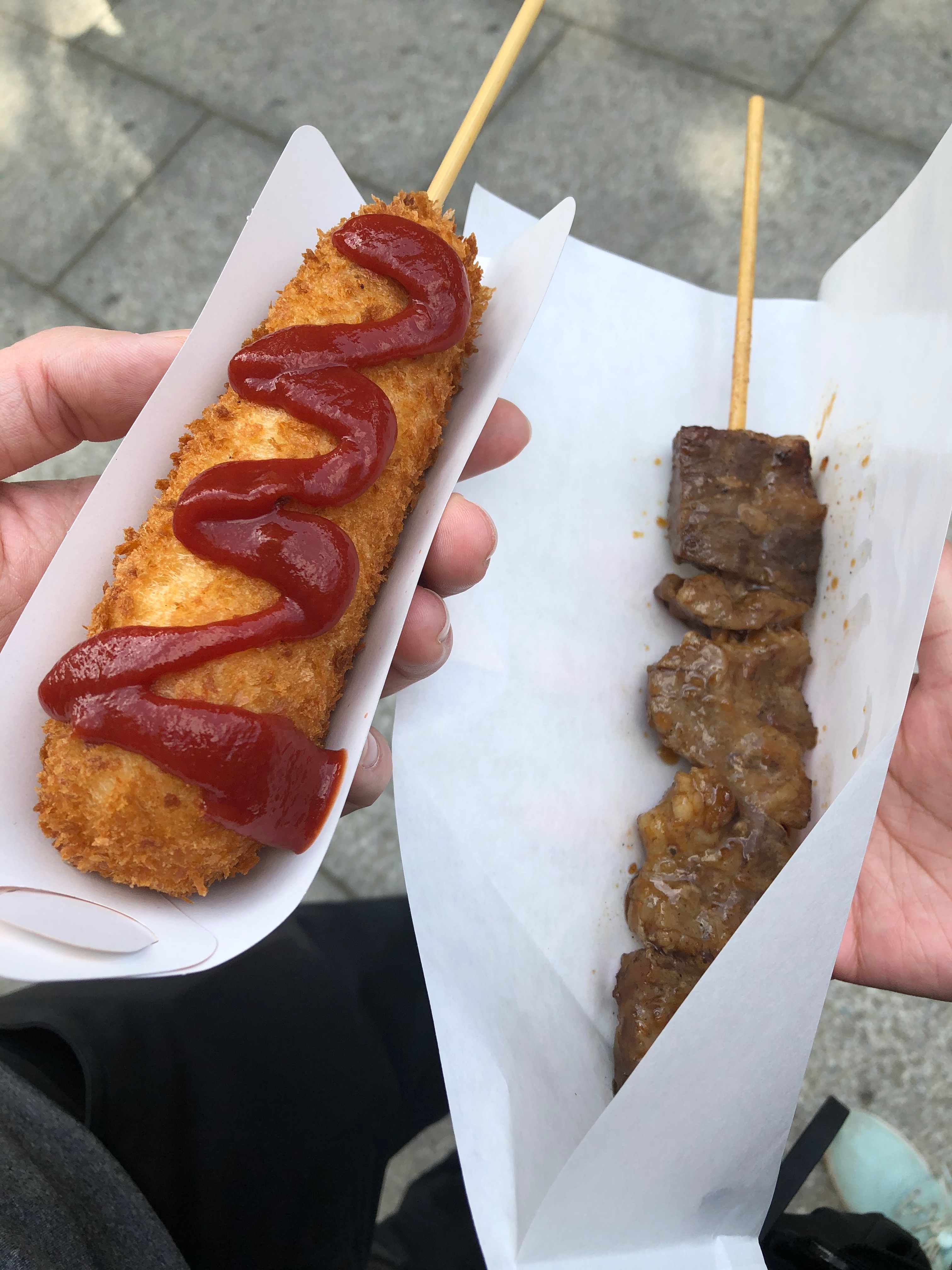 Our next objective was Maruyama Park. We grabbed a snack from the stalls — a corn dog and a beef skewer.