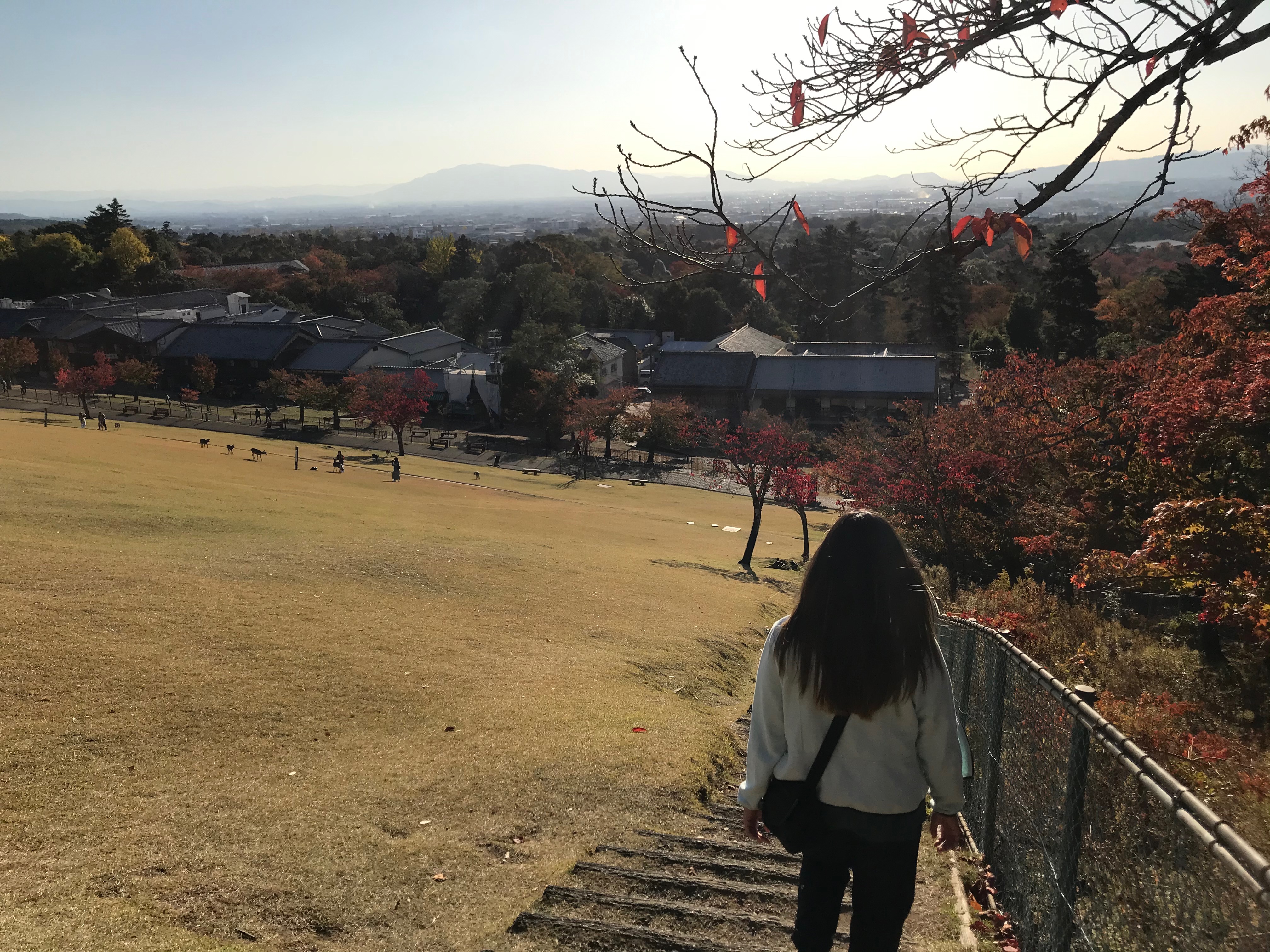 We continued to Wakakusayama Hill. The hill (or mountain) is covered in grass. You can pay a small 200 yen fee ( ~$3CAD) to hike to the top. We trekked for about 30 minutes to reach the peak and were rewarded with a beautiful view of Nara. The route up the mountain is well taken care of and easy to walk up. At the peak, there was a large group of students accompanied by their teachers that appeared to be celebrating a milestone in their education (perhaps a semester end celebration?).