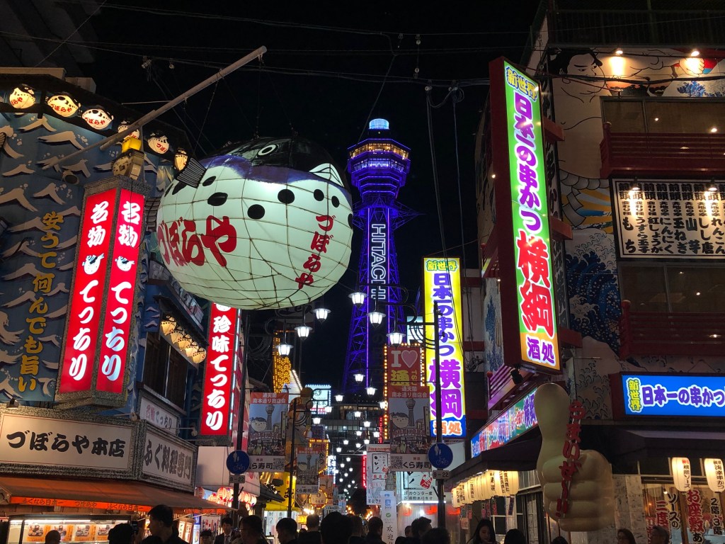 We headed straight to Shinsekai, an older neighbourhood in Osaka. It is often recognized by the balloon ‘fugu’ (blowfish/puffer fish) at the restaurant Zuboraya. If prepared incorrectly, fugu can be a poisonous dish (we did not take that risk). Another noticeable landmark in the Shinsekai district is the Tsutenkaku Tower. The tower sparkles in the background as its colour changes every few seconds. The tower has an observation deck, but we did not go.