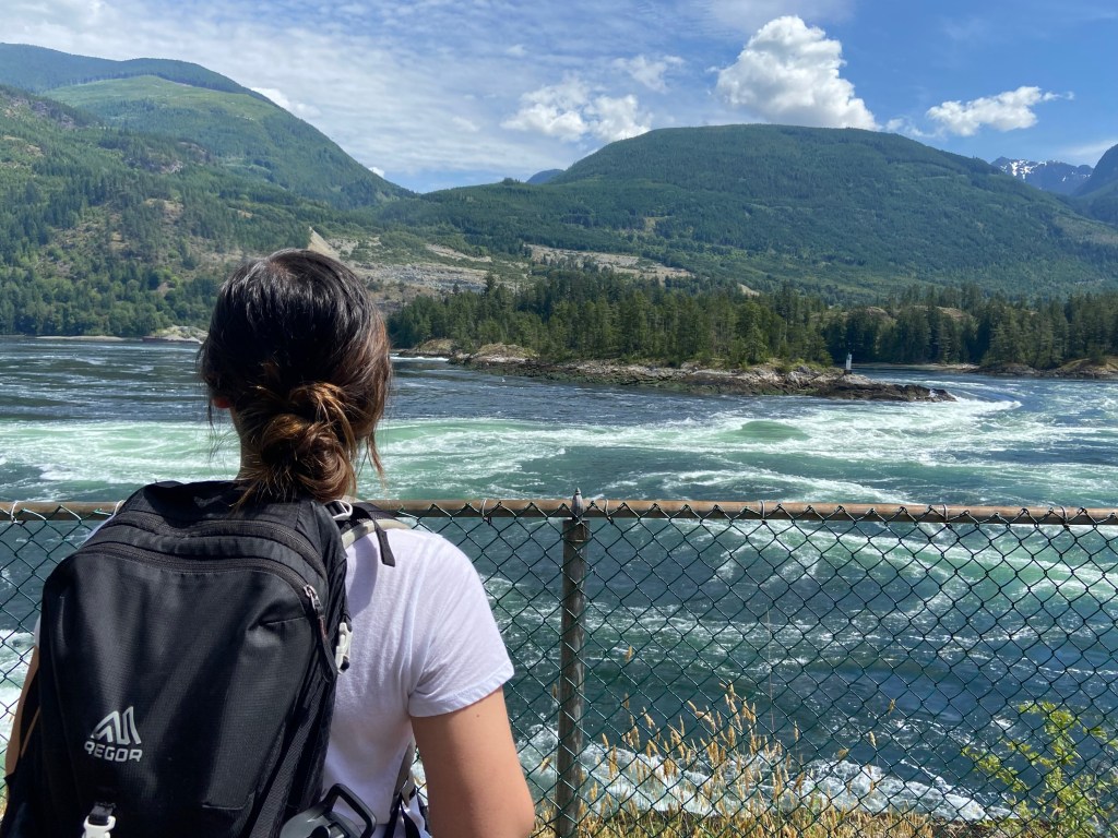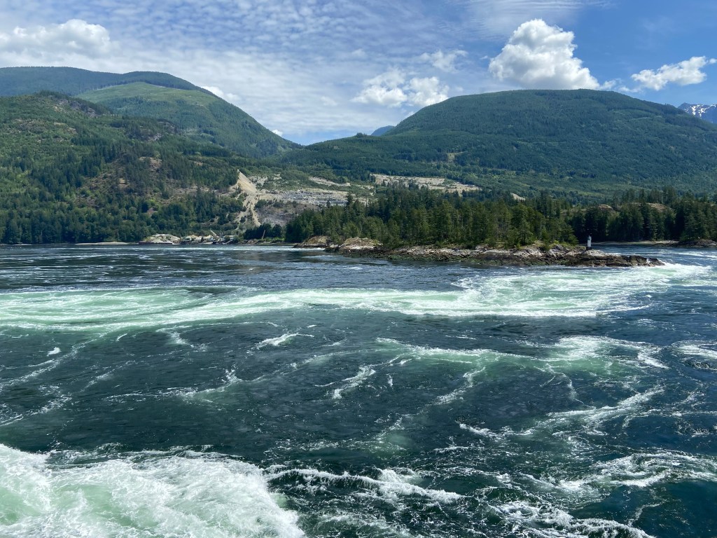 Our first destination was the Skookumchuck Narrows, home to the Sechelt Rapids. Roughly 200 billion gallons of water flow through the Skookumchuck Narrows connecting the Sechelt and Jervis Inlets creating whirlpools and 2m + high waves. Twice a day, the tide direction changes. Refer to the online calendar for the best viewing times (Note: Recommended viewing times change each day). The trail to the Skookumchuck Narrows took about 1 hour and is mostly flat with ample forest shade. The trail eventually splits into two routes leading to two possible view points— North Point and Roland Point. The North Point is busier and offers a better view, but you can get close to the water at Roland Point. We headed to Roland Point first, which was slightly further, and enjoyed lunch by the water.