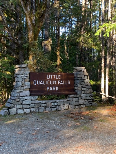 Our first stop on the way to Tofino was Little Qualicum Falls Provincial Park. This provincial park is home to the Qualicum Falls Loop — a short trail leading to two waterfalls. At the base of the trail, there are two potential routes — Lower Falls and Upper Falls. The trail is a loop so you can still see both waterfalls whichever way you go. We opted to head to the Lower Falls first.