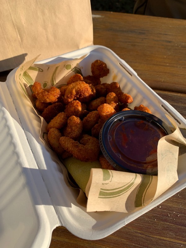 We drove past Cathedral Grove, which was unfortunately closed, so we continued to Port Alberni. We stopped at the Clam Bucket in Port Alberni, ordered cajun popcorn shrimp to go, and continued to Sproat Lake. We snacked on the cajun popcorn shrimp by the lake.