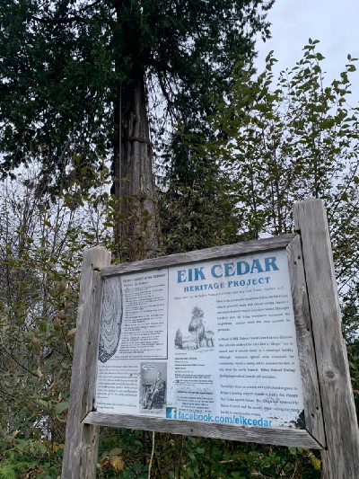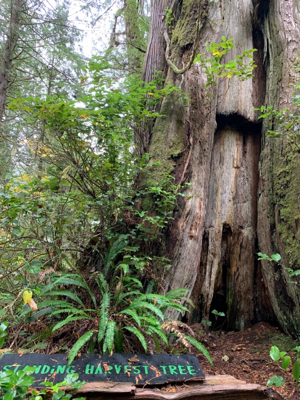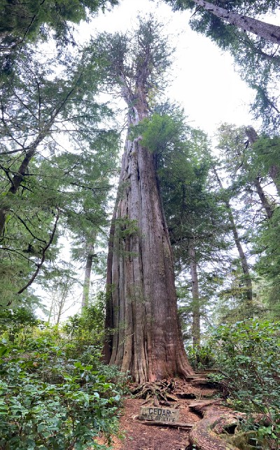 The water taxi dropped us off at the trailhead and would return in two hours to pick us up again. The trail begins on the boardwalk. It was recommended to stay on the boardwalk and not complete the trail loop as the trail was very muddy. We did not listen to this advice, and yes, the trail was extremely muddy! Luckily, there were scattered chunks of wood along the trail to help bypass the mud. The tall trees were amazing to see and protected us from the rain. Some of the trees are labelled — Cedar Tree of Life, Hanging Garden, and Standing Harvest Tree.