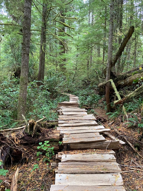 We headed back to the Airbnb to put on a few more layers and prepare for our trip to Meares Island. We arrived 15 minutes early for our water taxi to fill out waiver forms. After getting equipped with life jackets, we boarded the water taxi. The trip to Meares Island is quick — less than 10 minutes. In 1984, Meares Island was home to protests to discontinue logging operations on the island. These protests gained international attention and fostered major support for the environmental movement in BC. Today, Meares Island is a Tribal Park, meaning it is protected from logging. The main attraction on Meares Island is the Big Tree Trail, popular for its boardwalk and home to some of the tallest trees in BC.