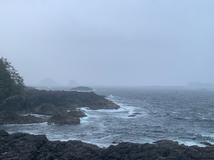 After lunch, we headed to Ucluelet to walk the Lighthouse Loop. Ucluelet is about a 40 minute drive from Tofino. The incoming storm was picking up. The Lighthouse Loop follows the water and offers amazing views of the tides. It is relatively flat and only takes about 35 minutes to complete.