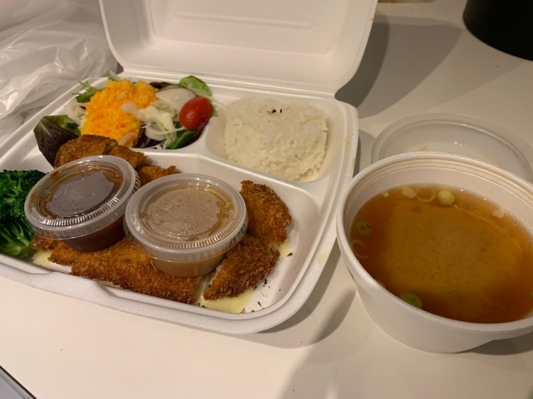 For dinner, we ordered takeout from Jacob’s Noodle and Cutlet, which we picked up on the walk back to the hotel. I ordered the cheese pork katsu (panko pork with a gooey cheese filling), which came with a salad, rice, miso soup, and two sauces for the katsu.