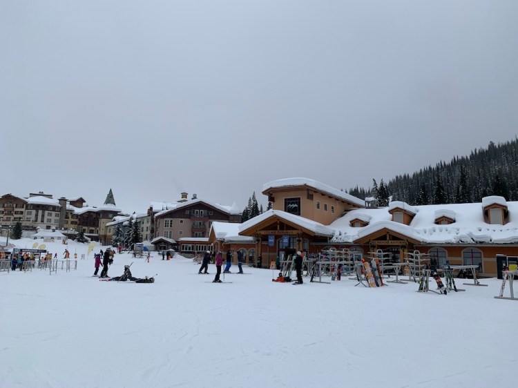 After a few morning runs, I took a break while my friend skied the advanced trails. I enjoyed a cup of hot chocolate with whipped cream from Cafe Soleil (located in the Village Day Lodge) and walked through Sun Peaks Village. The Village is nice, but was very quiet at the time. There are a few small restaurants. Mountain High Pizza seemed to be a popular spot for lunch.