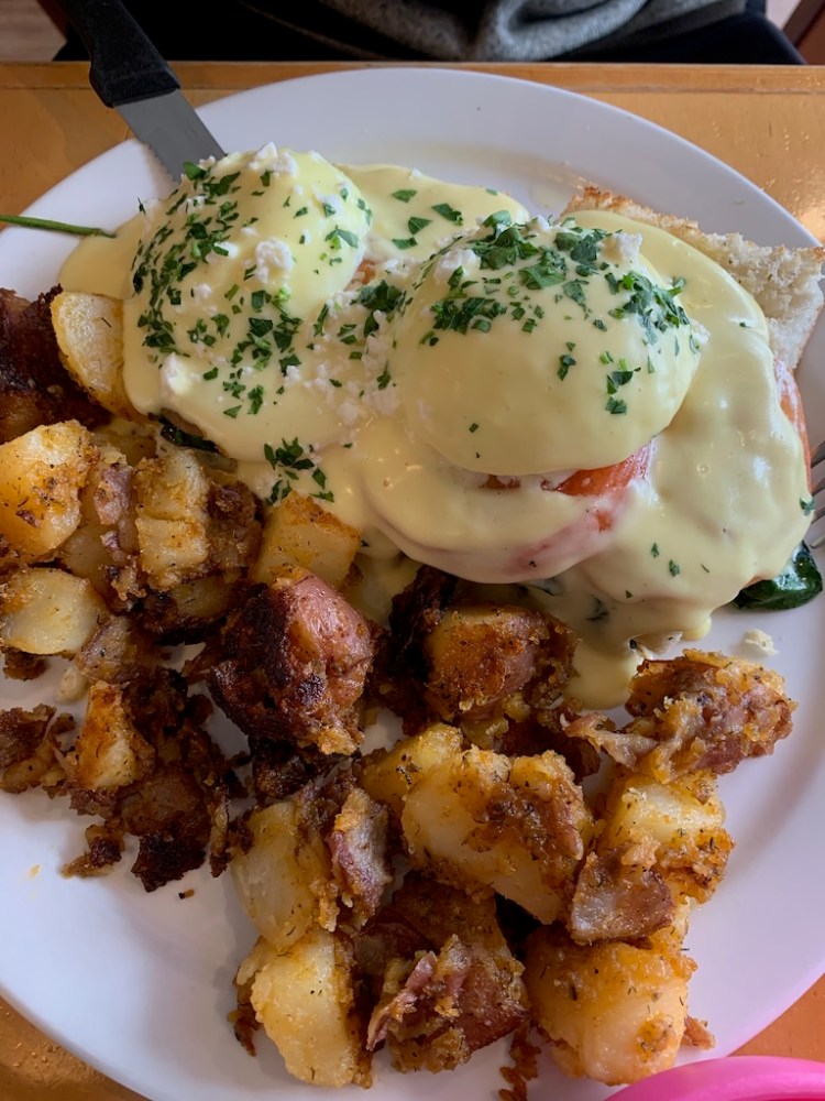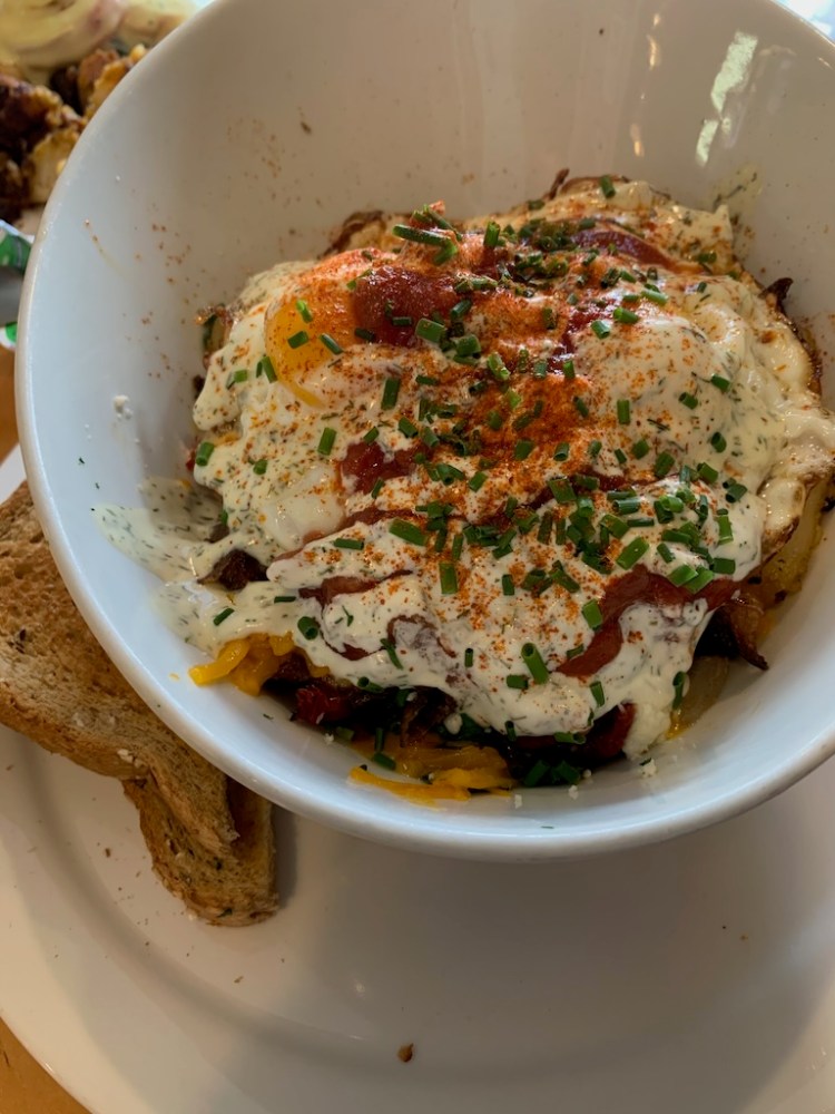 After checking out of our hotel, we headed to Hello Toast for breakfast, attempt #2 this week. It was less busy during this week day morning, but the restaurant was still full when we got there. Luckily, no one else was waiting. We beat the line, as a few other groups arrived just after we did. We ordered the ironman eggs bennies and the cayenne in the rain. The cayenne in the rain was so good! It was a mixture of potatoes, sun-dried tomatoes, spinach, red onion, eggs, and topped with feta cheese and cheddar. But the sauce – the salsa and dill with a dash of cayenne pepper and chives – was the real winner! What a great way to start the morning!