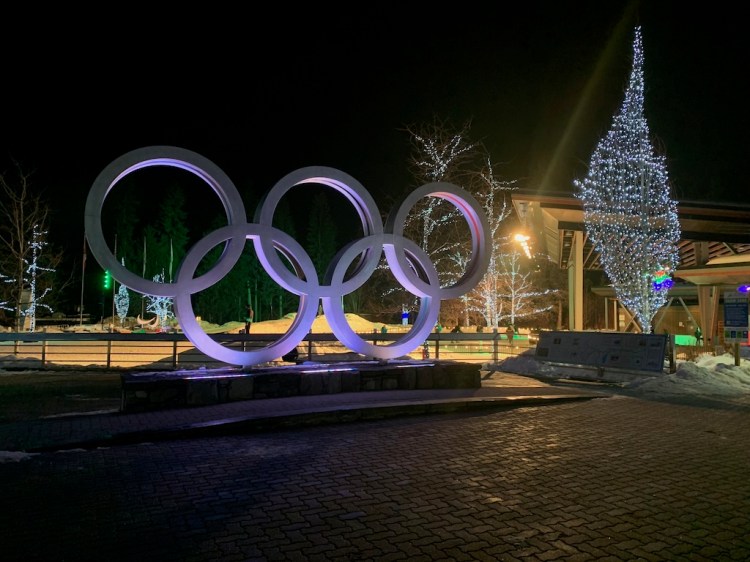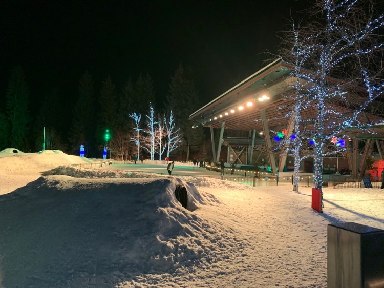 After dinner, we went on an evening stroll in Whistler Village. We passed the Olympic Plaza and the iconic Olympic Rings. Behind the Olympic Rings is the ice rink.