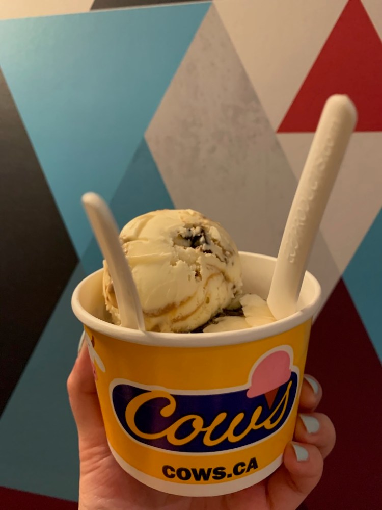 On our way back to the hotel, we stopped at COWS for ice cream. Despite it being cold outside, I had to get some ice cream! We shared a two flavour scoop bowl – moo york cheesecake (cheesecake ice cream with oreos and chocolate) and wowie cowie (vanilla ice cream with toffee, chocolate chips, and a house made candy bar).
