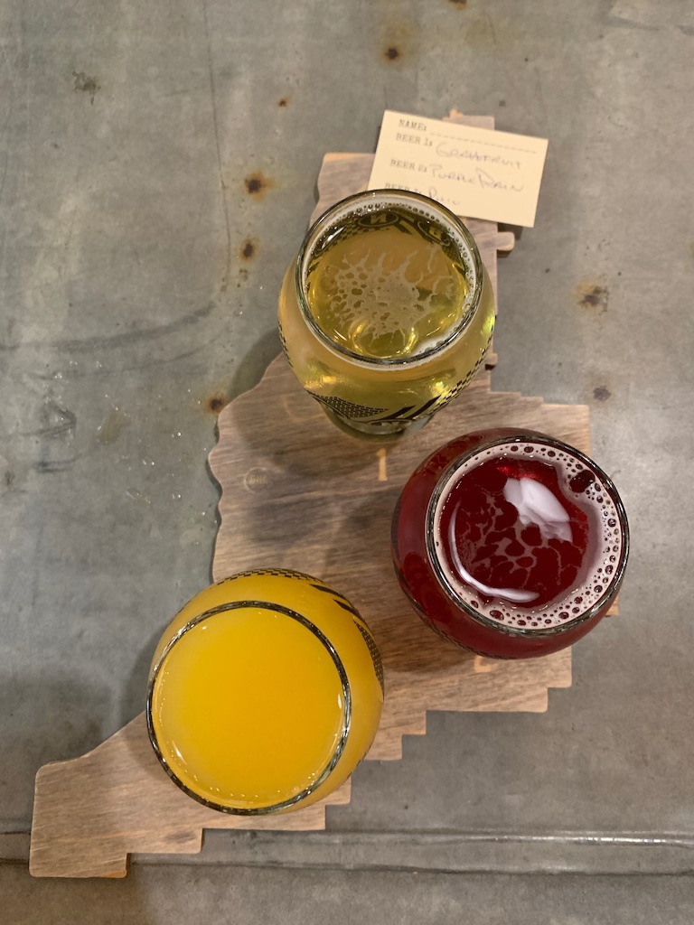 Our walk eventually led us to our first brewery for the evening – BNA Brewing. We ordered 2 flights from BNA. I particularly liked ‘Purple Rain’ – a berliner weisse style sour with a hint of blackberries. The shape of the flight holder at BNA Brewing was of the City of Kelowna, and it even marked the location of BNA on it!