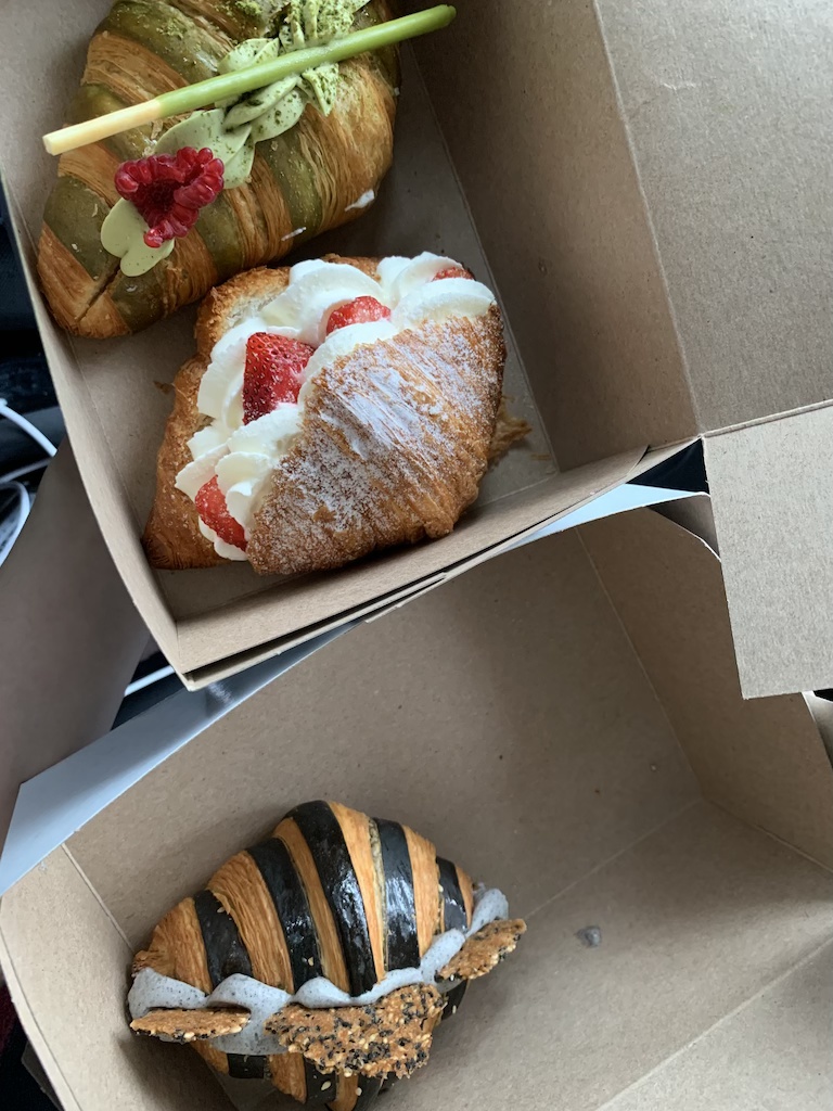 After wandering around Kensington Market, it began to rain. I was surprised to see everyone disappear off the streets due to the rain. Vancouverites would open an umbrella and carry on with their day, but Toronto does not react the same to rain. As a last stop in Kensington Market, we visited Little Pebbles Café for dessert. We shared the strawberry croissant, raspberry matcha croissant, and black sesame croissant.