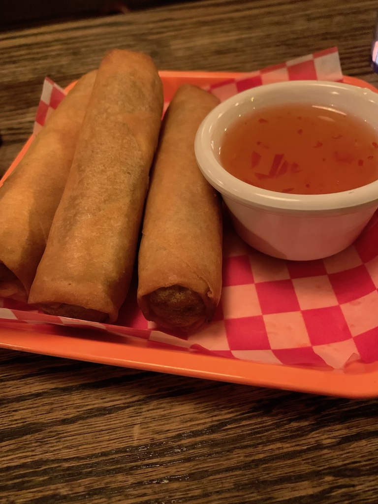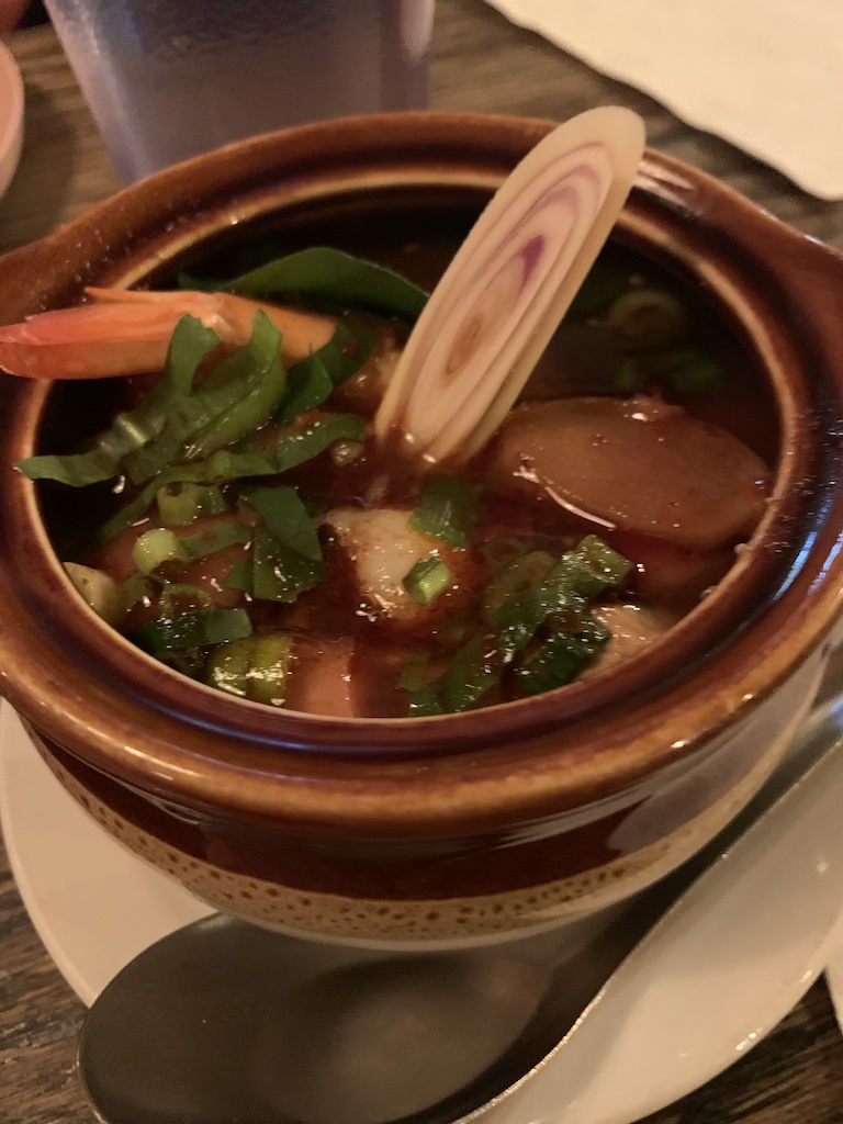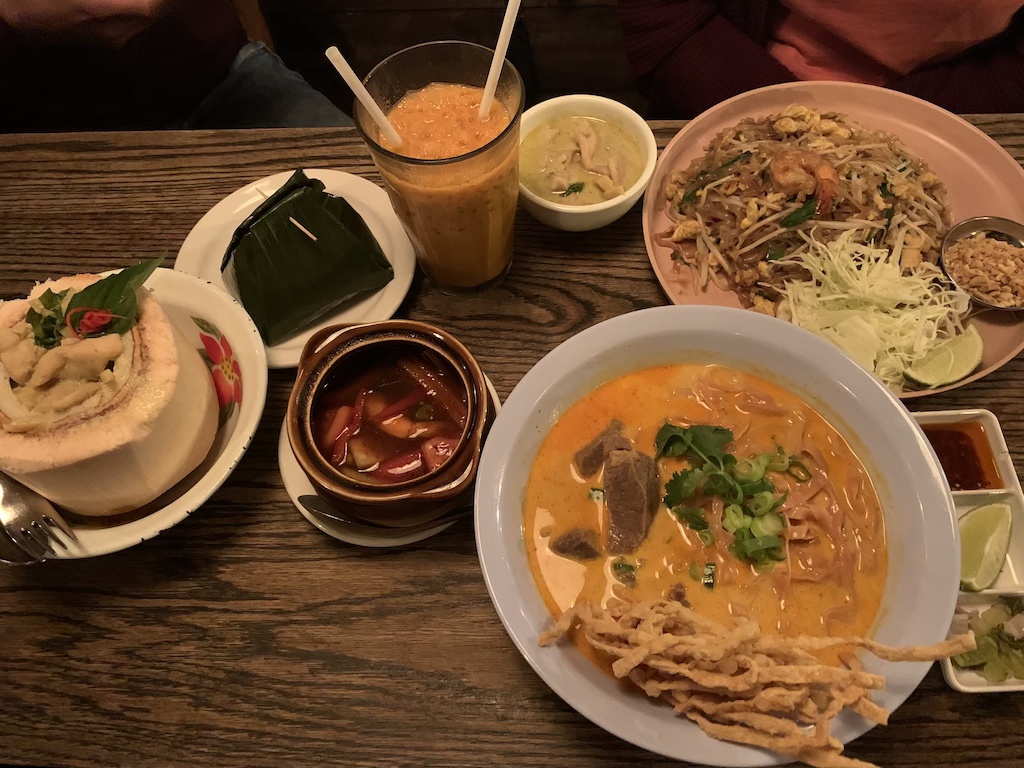Afterwards, head to dinner at Pai. Pai is a popular restaurant specializing in Northern Thai food. The food is delicious, but the presentation is really next level detail. We ordered an array of dishes – kung tawt garlic shrimp, springs rolls, tom yum soup, khao soi, pad thai, and green curry.