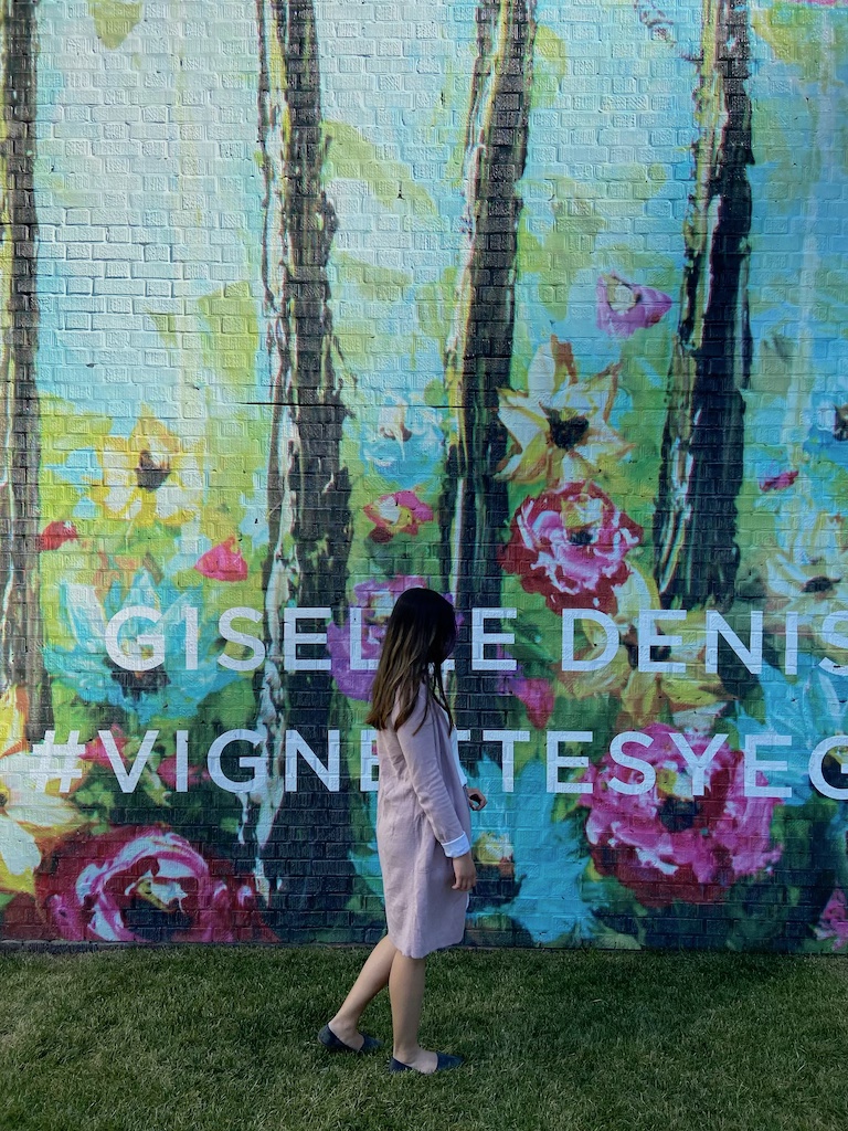 We continued to the Neon Sign Museum. On the way, we passed by a mural painted by Giselle Denis located at 10004 – 103A Ave NW. The flower background was a prime location for pictures, so we had to stop.