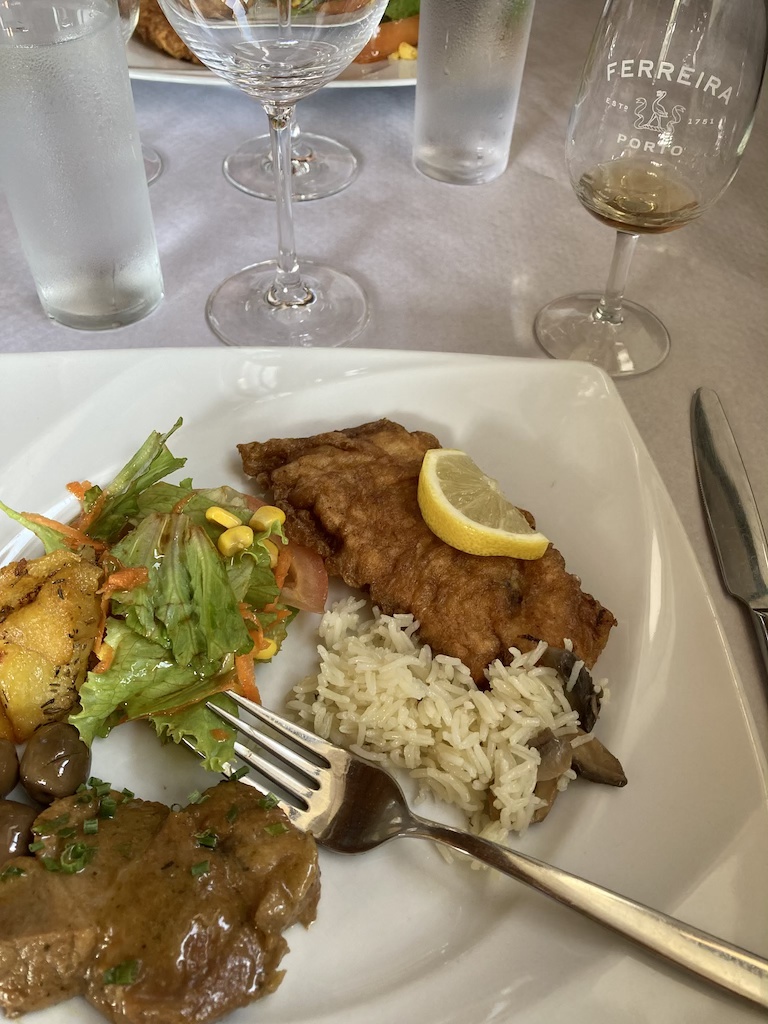 Once at Pinhao, it was time for lunch at Taberna do Rio. We were served fish, mushroom rice, potatoes, beef, salad, and more wine! The potatoes were my favourite.