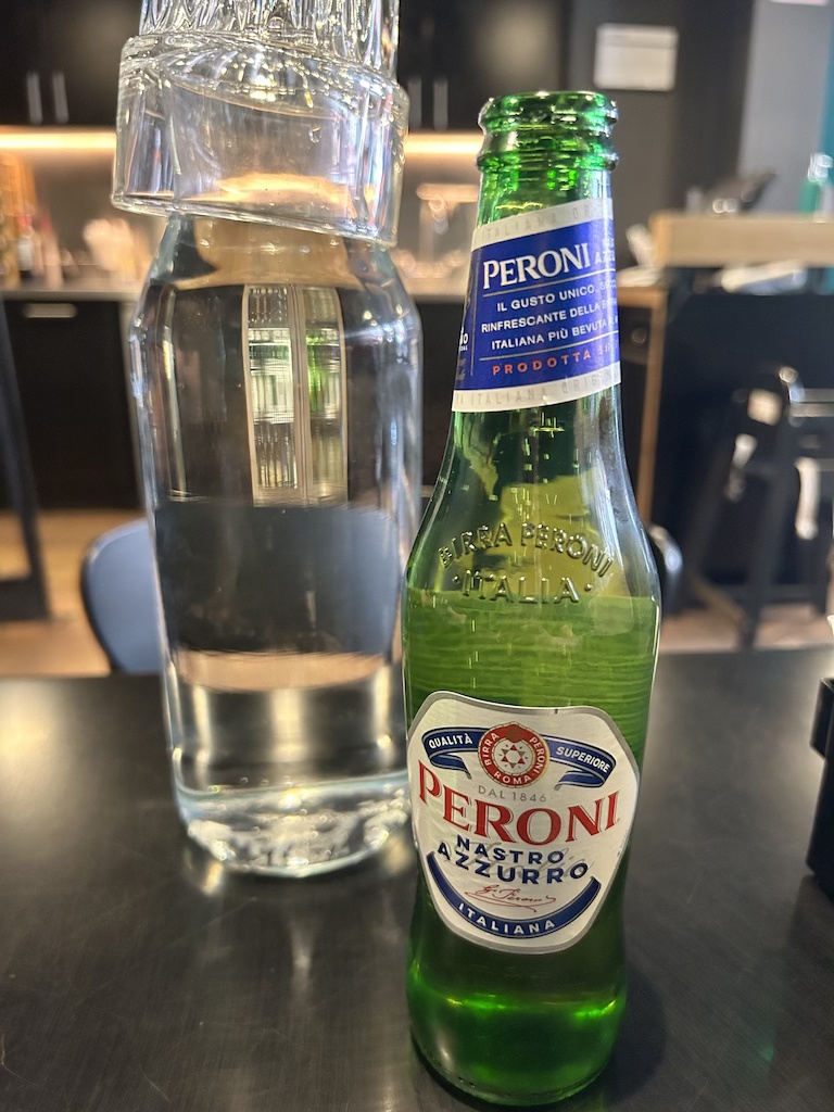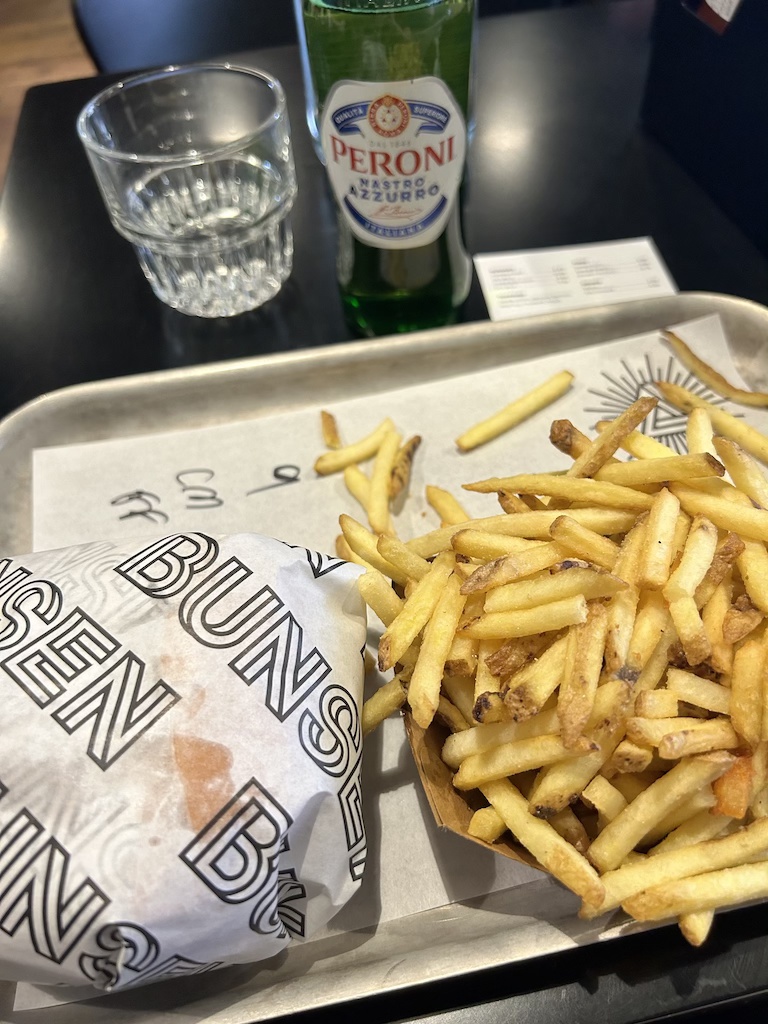 Bunsen has a small menu with only four options for burgers – one meat patty, two meat patties, then both options with cheese. Topping options are pickle, onion, lettuce, tomato, ketchup, mustard, and mayo. They have three options for fries – hand cut, shoestring, or sweet potato – as well as a limited drink menu. I ordered the cheeseburger and a Peroni beer (an Italian beer).