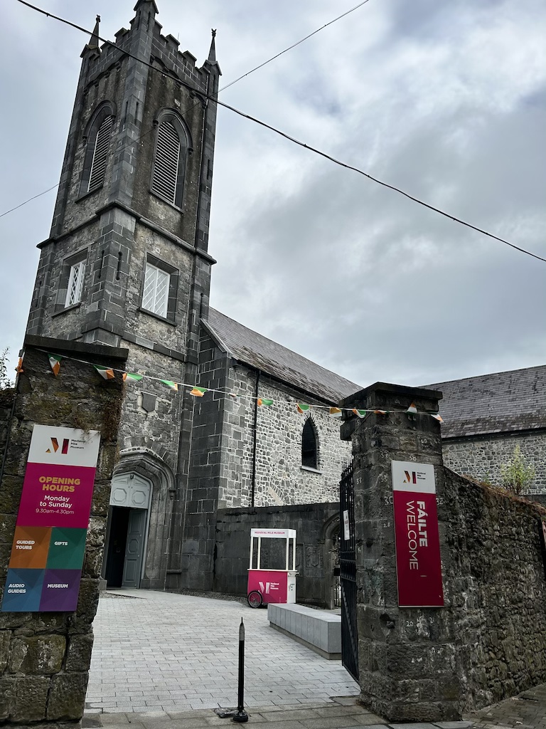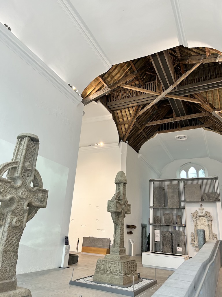 Afterwards, I walked to Saint Mary’s Medieval Mile Museum. The museum was once one of the many churches in Kilkenny. It was built in 1202, but deconsecrated in 1957, then converted into a museum in 2017. The admission fee for the museum is 8 euros/person and includes a self-guided tour. The front desk will give you a small device that can scan the QR codes scattered around the museum to provide more details on what you are looking at. The graveyard is still intact and open to the public to wander as part of the admission fee. What I found interesting is that archaeologists are able to determine the age of the tombstone based on what is inscribed and how it is inscribed.