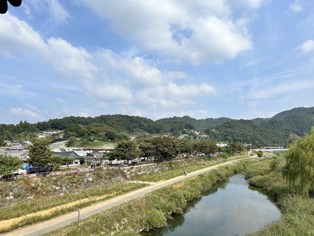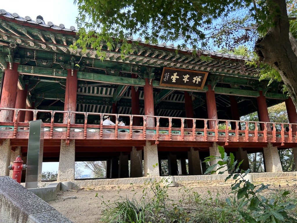 Next, we wandered Jeonju Hanok Village on foot, stopping by Jeondong Cathedral, Pungnam Gate, Nambu Market, Gangnam Calligraphy Museum, Cheonyeollu Pavillion, and Jeonjuhyyanggyo Confucian School (in that order). Jeondong Cathedral is a Roman Catholic church built between 1908 and 1914. The Pungnam Gate did not seem as grand when we visited as it was under renovation at the time. It was built in 1734 during the Joseon dynasty. Nambu Market was quiet and like many other South Korean markets, is lined with stores selling produce and houseware. There are also restaurants and there is a night market on select days. The Gangnam Calligraphy Museum is a two floor building with two large rooms showing different forms of calligraphy – there is not much to see here, but it’s an option if you’re in the area. Cheonyeollu Pavilion is a great spot to rest your feet (no food or shoes allowed in the pavillion). We spent some time admiring the scenery of the mountains and the Jeonjuchun River (which runs through the city of Jeonju) from the pavilion. The Jeonjuhyyanggyo Confucian School was established during the Joseon Dynasty in 1410. There are still classes at the school and we had a lovely conversation of Korean and English using Google Translate with a volunteer, who was excited to tell us about the school.