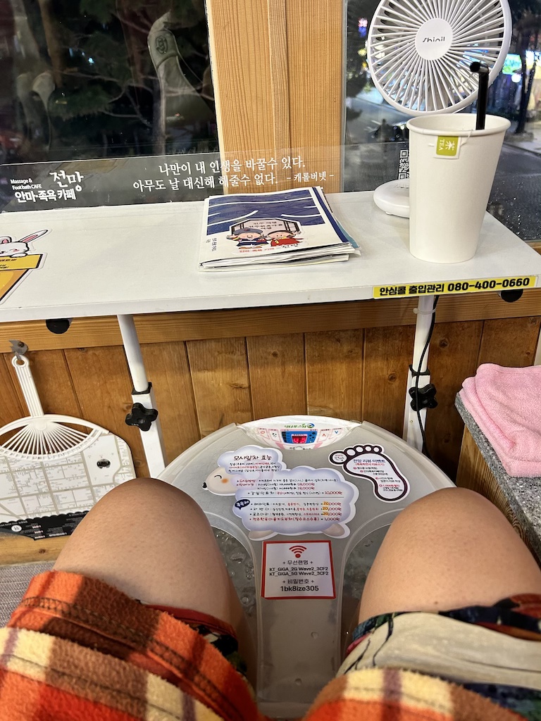 After 11 days of travel, our feet were exhausted, so we stopped for a herbal foot bath on the way home. The spot we picked was right above the PNB Chocopie in the center of Jeonju Hanok Village (not sure what the store is called). We picked our foot bath scent, were given spa pants to change into and got a free drink while we relaxed for 25 minutes.