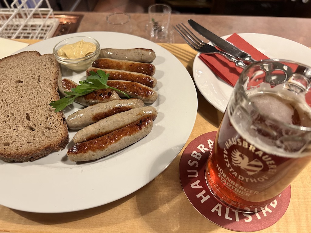 Hausbrauerei Altstadthof is the oldest brewery tavern in Nuremberg – the name has changed over the years, but its history dates back to the 14th century. Their speciality is the malt red beer, the Nuremberg Stadtbier, which I ordered (of course!). For food, I ordered a plate of the Nuremberg sausage, brown bread, and hot mustard. Nuremberg sausage is a specialty of the area consisting of pork, bacon and spices (marjoram is the key spice) in sheep casing.