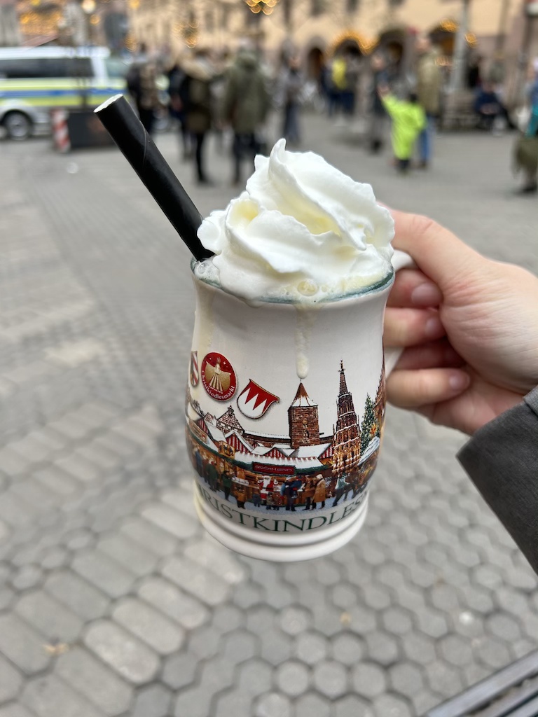 It was time for an afternoon Christmas Market drink. I ordered the Eierpunsch hausgemacht from a local vendor, which is essentially a warm eggnog mixed with wine and rum and topped with whipped cream. To be honest, I was not a huge fan – I’m not sure if it was because it was too sweet or if the mix was just not for me. The mug costs an extra 5 euros, which is refundable if you return the mug. I kept my mug for the memories however!