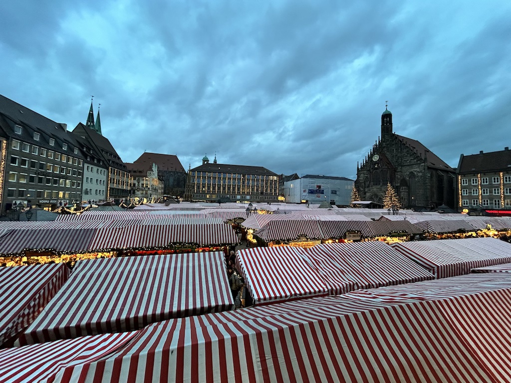 From there, I walked to the Central Market Square (or Hauptmarkt in German), the location of the Nuremberg Christmas Market. Two iconic landmarks in the square is the Schoner Brunnen, a 14th century fountain, and the Catholic church, Frauenkirche (also known as the Church of our Lady).