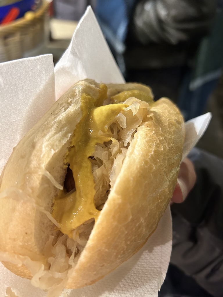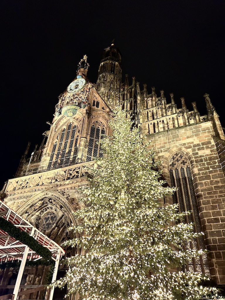 For dinner, I had wanted to go to a restaurant called “Trödelstuben”, Wein- und Bierstuben, but they were fully booked and not accepting any walk-ins. As it was raining quite heavily, I did not want to wander around looking at other restaurants, nor wait outside until a table cleared up, so I got a Nuremberg sausage sandwich with sauerkraut and hot mustard from one of the Christmas Market stalls for dinner. Just before heading back to the hotel for the evening, I snapped a photo of the Christmas tree and Frauenkirche lit up.