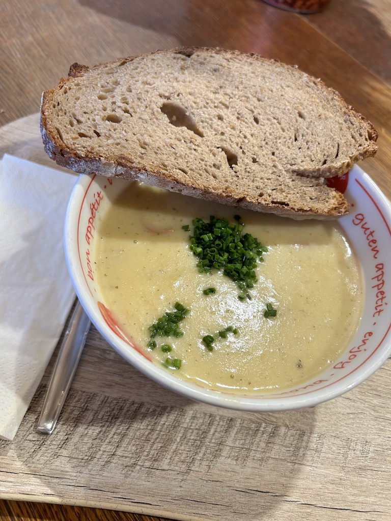 Marienplatz was also quite busy due to the Christmas Market. I was headed to Viktualienmarkt, the outdoor Farmer’s Market nearby and in particular Münchner Suppenküche, a soup restaurant. It was raining, so what better way to warm up than to have soup. During the summers, there is a beer garden at Viktualienmarkt, which I’m sure is a popular destination for locals and tourists. Münchner Suppenküche is outdoors but covered and has lots of soup options to pick from. I wanted something classic Bavarian so I ordered the Altbayerische Kartoffelsuppe (Old Bavarian Potato Soup).