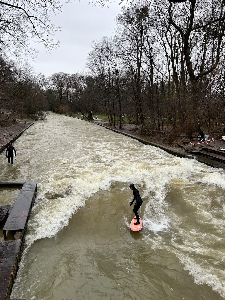 About a 10 minute walk from the Residenzmuseum is Eisbachwelle, which is near the entrance to the Englische Garten. Eisbachwelle is a popular spot for surfers as the river generates waves perfect for the sport. It is fun to watch the surfers brave the waves. The Englische Garten is a large public park (417 hectares) and is very popular during the warmer seasons especially due to the beer garden near the Chinese Tower. It was rainy and dreary, so not as exciting unless you like muddy pathways.