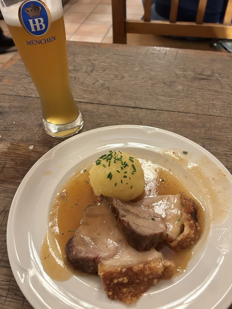 For dinner, I walked to the Hofbrauhaus Munchen, a 3-floor beer hall with space for over 1500 people. The beer hall serves food and 1L mugs of beer. The Hofbrauhaus Munchen is the city’s most famous beerhall and it has been around since 1589. For those who have seen the videos of servers carrying 14-16 1L-mugs of beer to tables, this is exactly the place to see it in real life (if you haven’t, definitely look it up online – it’s pretty cool). There are greeters at the door who can help you find a table, but no one will stop you if you try to seat yourself. Most people also don’t mind sharing tables if there is room at the table. Every table was occupied during my visit, but I spotted space at a table with another couple so I sat down. Not only was this beer hall extremely busy, it was surprisingly organized. I was handed a menu almost immediately after sitting down and they took my order shortly after. I ordered the roast pork crackling (Krustenschweinebraten) and their wheat beer, Münchner Weisse, which only came as a pint. The Krustenschweinebraten came with a potato dumpling and was covered in gravy. The dish was good and reminded me of Chinese crispy roasted pork belly, but there was a very thick layer of fat that I could not finish. The potato dumpling was gooey and soft, which I really liked.