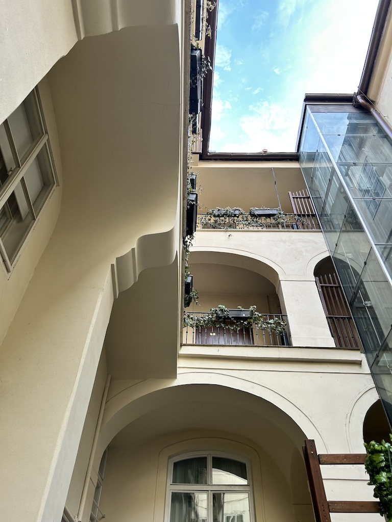 My day started with a trip from Vienna to Prague by train. I picked up a pretzel from one of the bakeries at the train station. The train ride is 4 hours long, and I arrived in Prague just after 11:15am. Once I arrived in Prague, I purchased a 24-hour transit ticket, then headed to my hotel, Three Golden Crowns Apartments, in the Malá Strana area. My room was already ready, so I was able to drop my bags directly into my room. The room was very big with a kitchen area, like an apartment. The courtyard of the hotel was cute too and had an open roof. The front gate is locked between 9am-10pm so you get a key to unlock/lock it if you are returning/leaving outside the “open” hours.