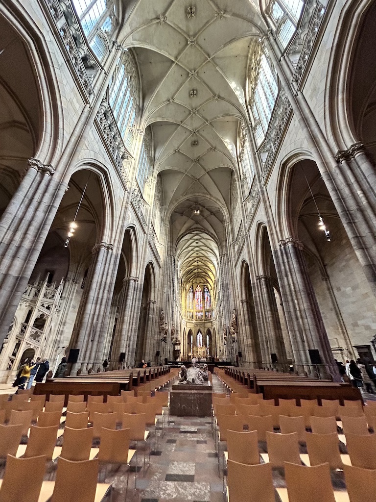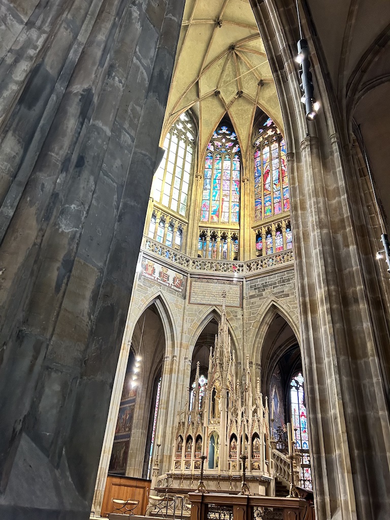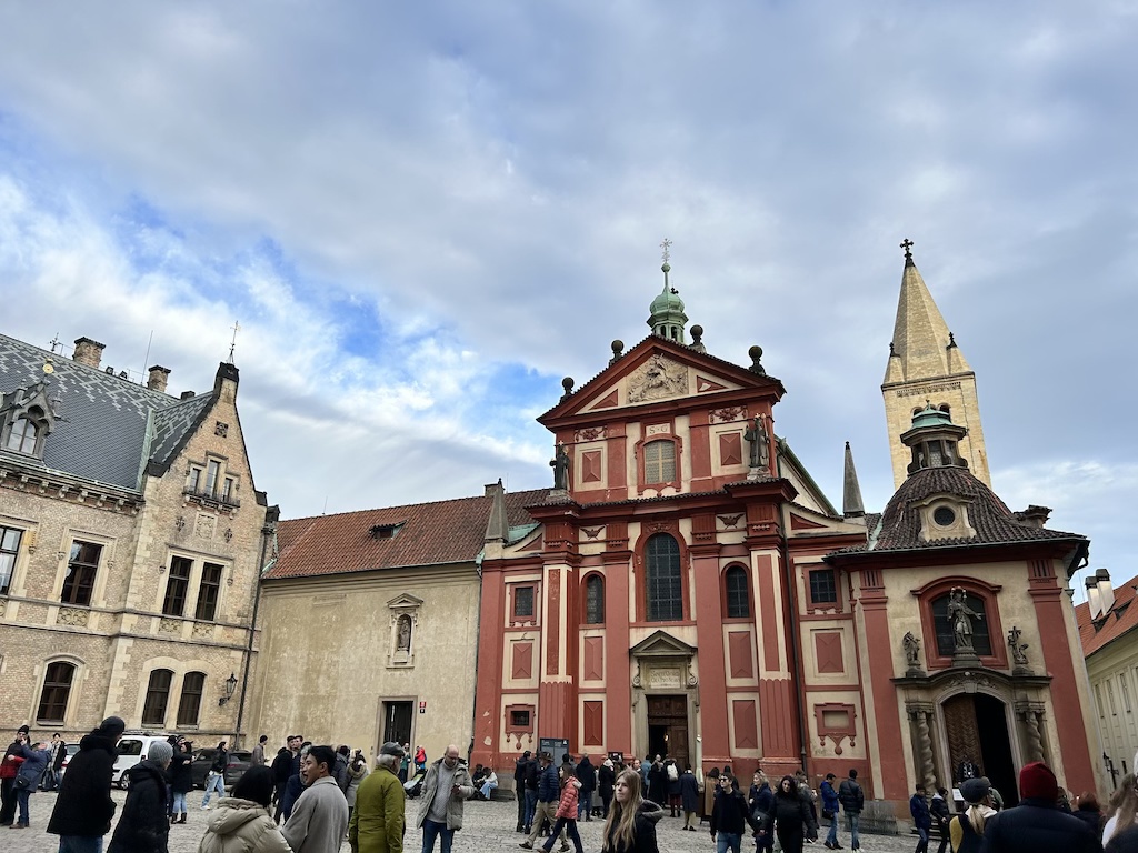The Prague Castle is a large complex with multiple historical buildings. There are guards in front of the large yellow building near the entrance due to it being the workplace and residence of the Czech Republic President. The castle complex was built in 870 and since then, has been the home of Bohemian kings, emperors, and presidents. There are different ticket options, but the most commonly bought ticket includes entrance to the Old Royal Palace, St. Vitus Cathedral, St. George’s Basilica, and the Golden Lane. There are ticket scanners at each entrance. The Old Royal Palace has a Gothic and Renaissance architecture and its history dates back to the 12th century. The most important room is the Vladislav Hall, which has seen many commemorative royal events in its lifetime. St. Vitus Cathedral is a Catholic Church within the castle walls and was originally built in 930! Within the cathedral walls are the tombs of many of the country’s rulers. St. George’s Basilica may be smaller in comparison to St. Vitus Cathedral, but age-wise, it has been around longer than St. Vitus Cathedral. St. George’s Basilica completed its build in 920 and was built in a Romanesque style. The Golden Lane is a narrow street filled with small colourful houses. The houses show glimpses of what it was like to live in this area many years ago.