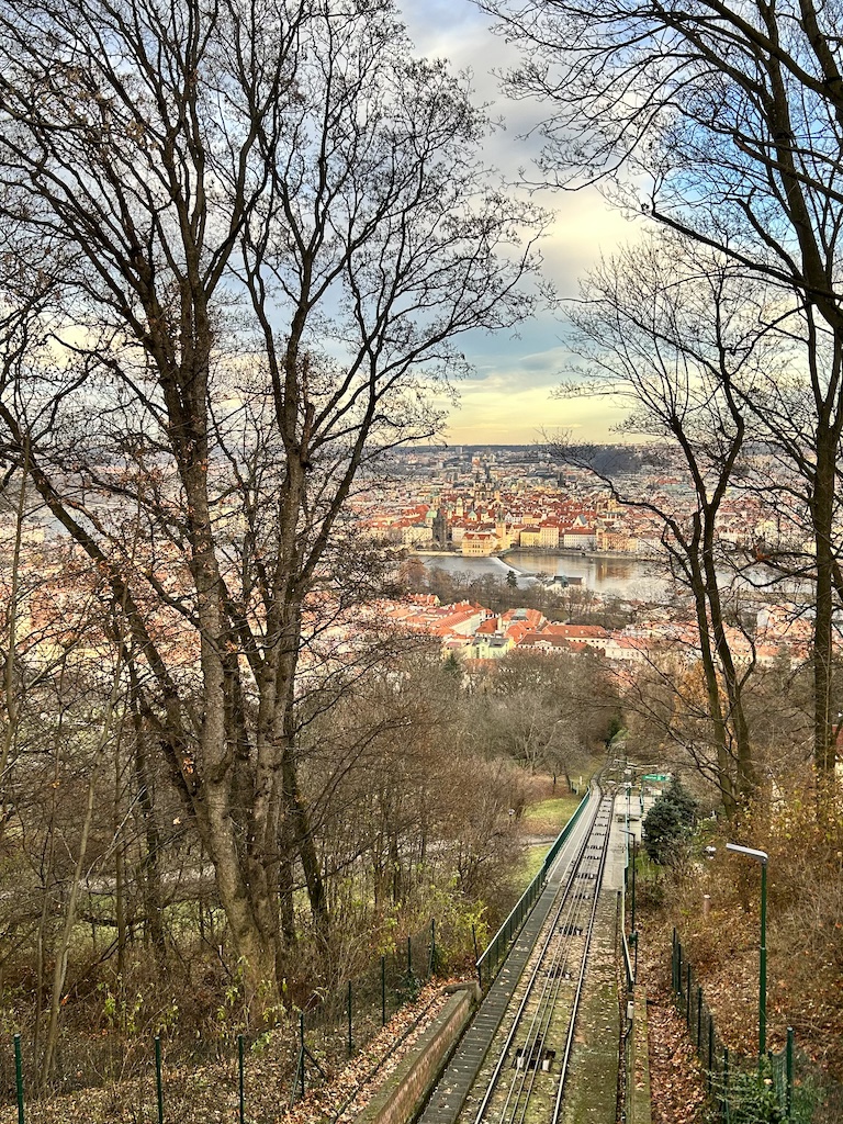 2:30pm: Take the Petrin Funicular at the Újezd Station (4 minute transit from Prague Castle). The funicular takes about 10 minutes to go up the hill. Visit the Petrin Lookout Tower. Walk down the mountain and stop at the viewpoint on the bridge overlooking the funicular.