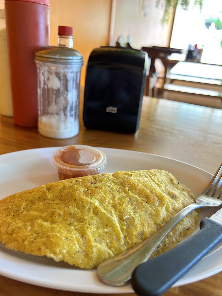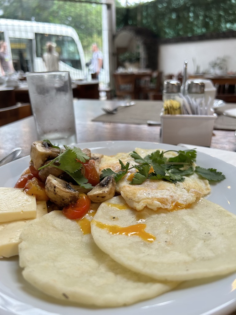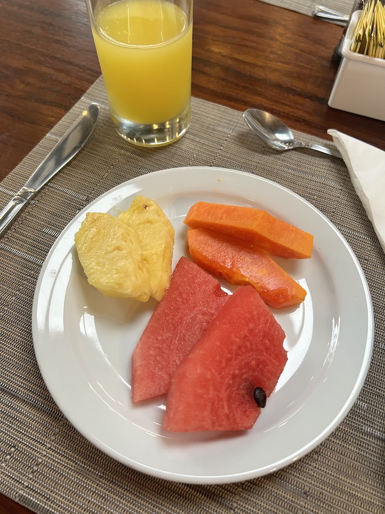 I woke up early for breakfast, which was included in my stay. There were a couple of options on the menu. I picked the eggs with the mushroom and tomato mix, which also came with flat tortillas and cheese. The meal started with fresh fruit – watermelon, papaya, and pineapple. There is self-serve coffee and tea.