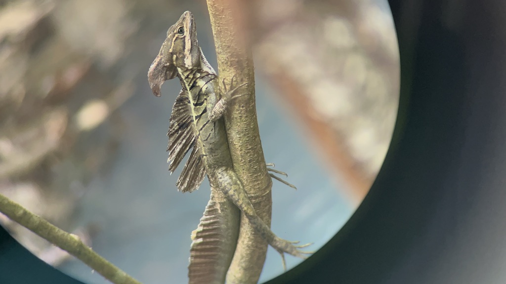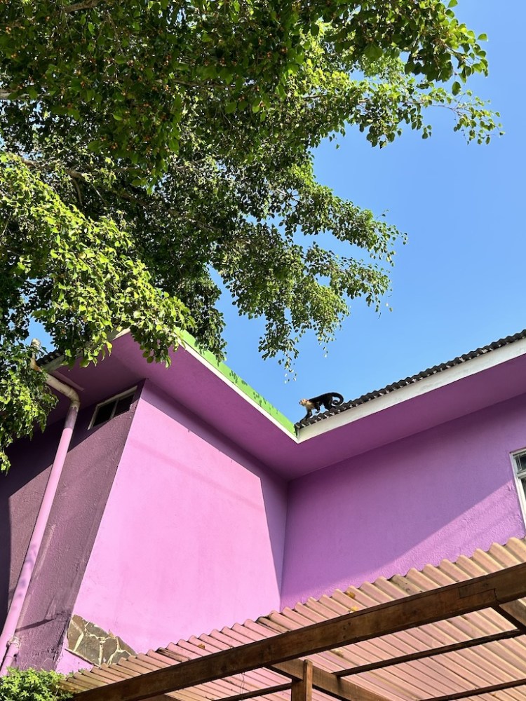 My day started early. I had booked a morning Manuel Antonio Tour and the tour bus came to pick me up at 7:15am. The tour does pick-up and drop-off at your hotel, but you can choose to stay at the park afterwards, but you’ll have to figure out how to get back to your hotel yourself. That’s easy enough though – there is a bus that goes back and forth from the National Park to Manuel Antonio (town). I packed my swimsuit, because I wanted to stay at the park after the tour. While waiting for the tour van, I watched the capuchin monkeys chasing each other on the rooftop of my hotel, Peace of Paradise.