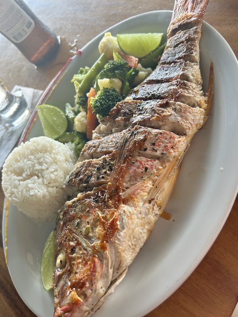 I took the bus to Emilio’s Cafe for an early dinner. Emilio’s Cafe has a beautiful overlook and great food. I ordered the grilled red snapper, a classic Costa Rican dish, and a cold beer.
